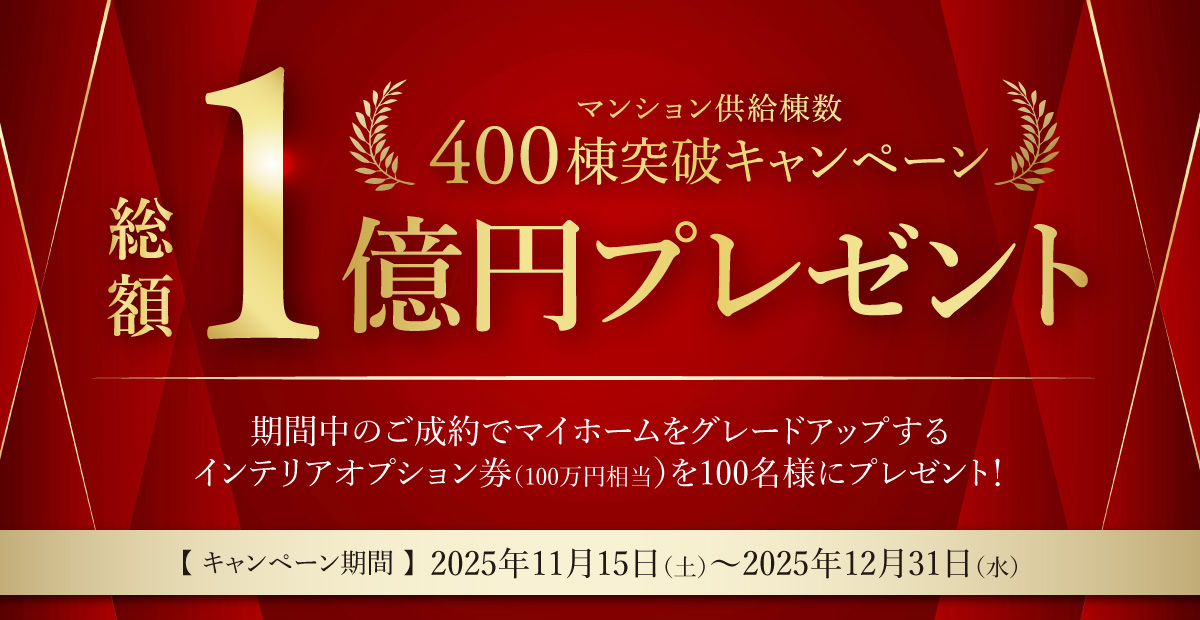 ■キャンペーン概要●キャンペーン期間/2025年11月15日(土)~2025年12月31日(水)●賞品/100万円相当(税込)のインテリアオプション券×先着100名様で総額1億円。※賞品は引渡後のお渡しとなります。●対象物件/クレアホームズ天竜川駅前、クレアホームズ北上尾、クレアホームズ春日部センタープレイス、クレアホームズ川口市役所前通り、クレアホームズフラン横浜戸塚、クレアホームズ札幌医大南、クレアホームズ二十四軒、クレアホームズ郡山神明町、クレアホームズフラン白石、クレアホームズ上の橋、クレアホームズ住ノ江、クレアホームズ堺東 北三国ヶ丘、クレアホームズ米子駅、クレアホームズ松江大橋、クレアホームズ松山東高前、クレアホームズ道後上市 ザ・プレミアム、クレアホームズ大街道 ザ・プレミアム、クレアホームズ道後西、クレアネクスト尾ノ上レジデンス、クレアネクスト桜坂 ザ・レジデンス、クレアネクスト荒田 ザ・レジデンス、クレアネクスト九大学研都市 ザ・レジデンス、クレアネクスト九大学研都市駅前、クレアホームズフラン博多祇園●対象者/キャンペーン期間中に対象物件をご成約いただき2026年3月31(火)までに引渡完了することが条件(ご成約キャンペーンを利用できるのは1世帯1回限りとし1物件のみとします)。契約解除となった場合や引渡が2026年4月1日(水)以降の場合は無効となります。●備考/本キャンペーンは予告なく変更または終了する場合があります。他のキャンペーンと併用はできません。インテリアオプションに起因または関連した一切の損害について責任は負いません。キャンペーンの詳細は各物件担当者にお問い合わせください。 本キャンペーン対象外の住戸がございます。詳しくは係員にお尋ねください。